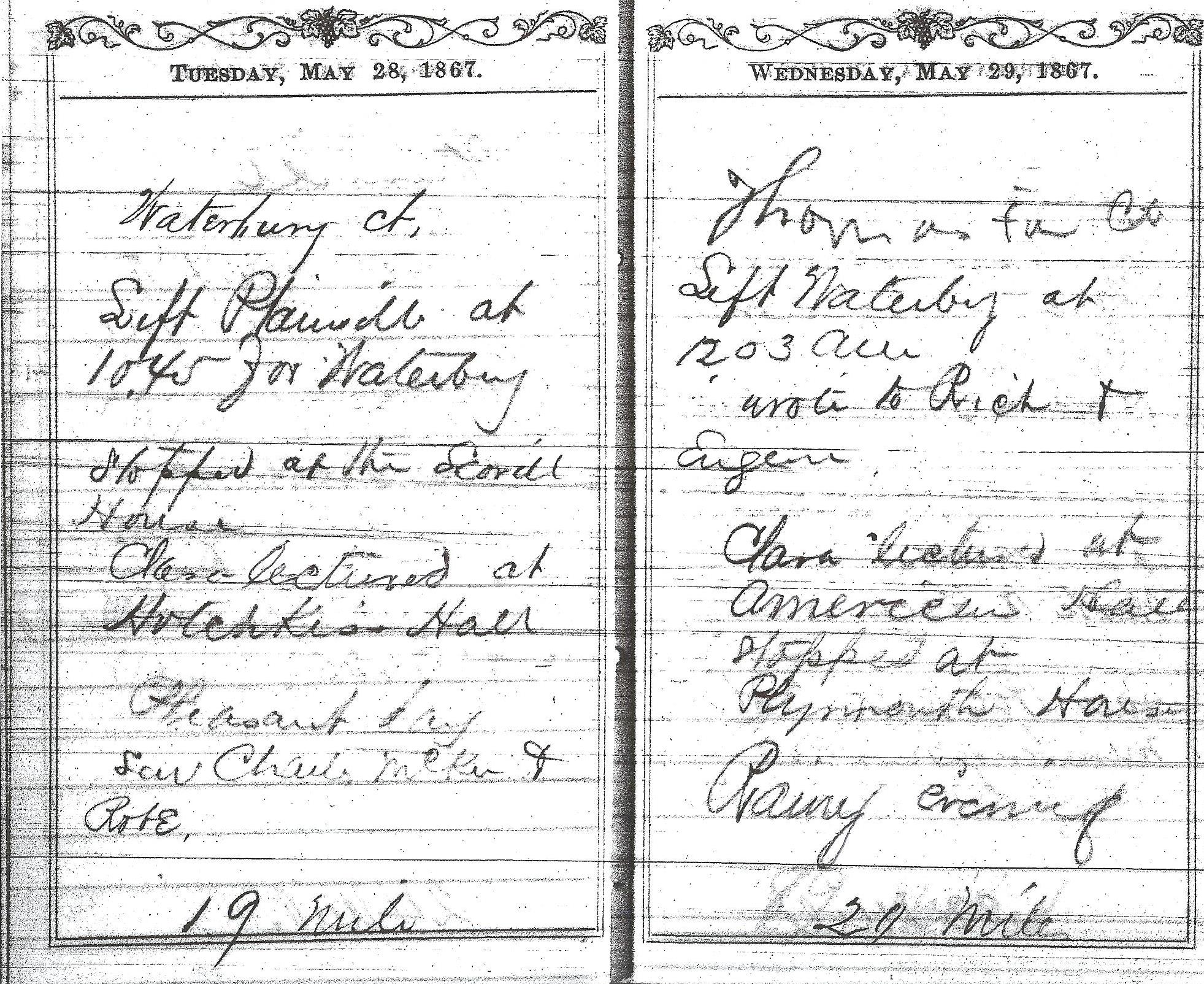 . This entry from the diary of Dorence Atwater indicates that he and Clara Barton gave a speech at the Hotchkiss Hall in Waterbury, CT on May 28, 1867, then traveled to Thomaston, CT to give a speech on May 29. It mentions that they “stopped at Plymouth House”, presumably Atwater’s family home. Atwater also gave speeches on his own.