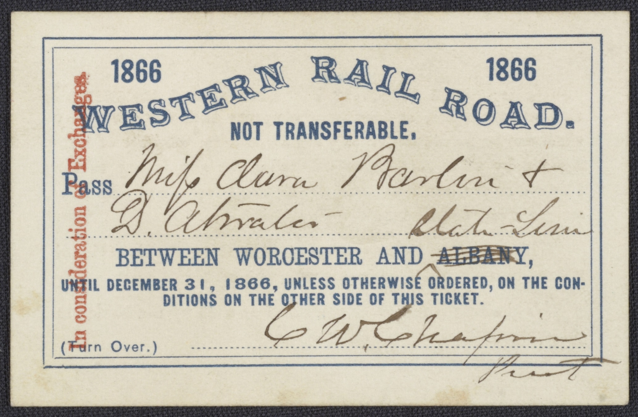 Railroad Pass for Clara Barton and Dorence Atwater.