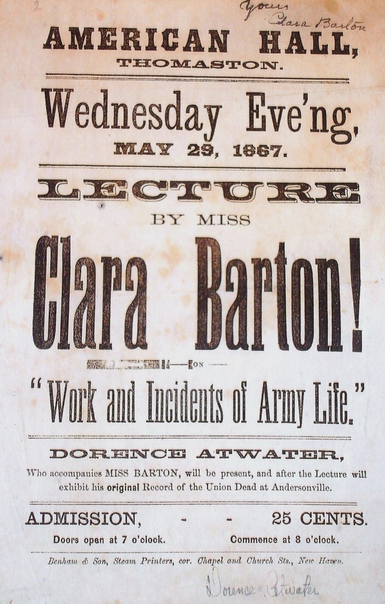 Poster advertising a speech given by Clara Barton and Dorence Atwater in Thomaston, CT in 1867.